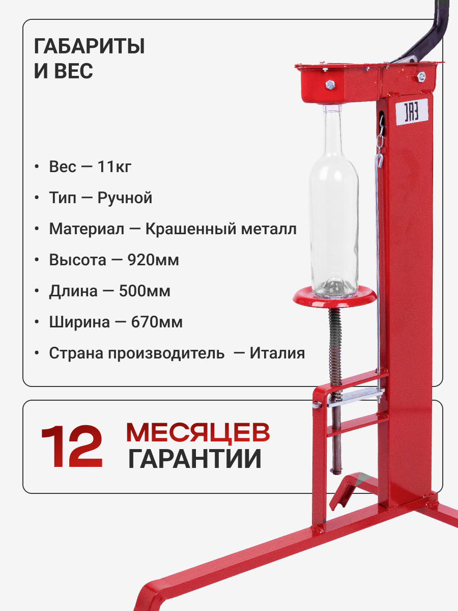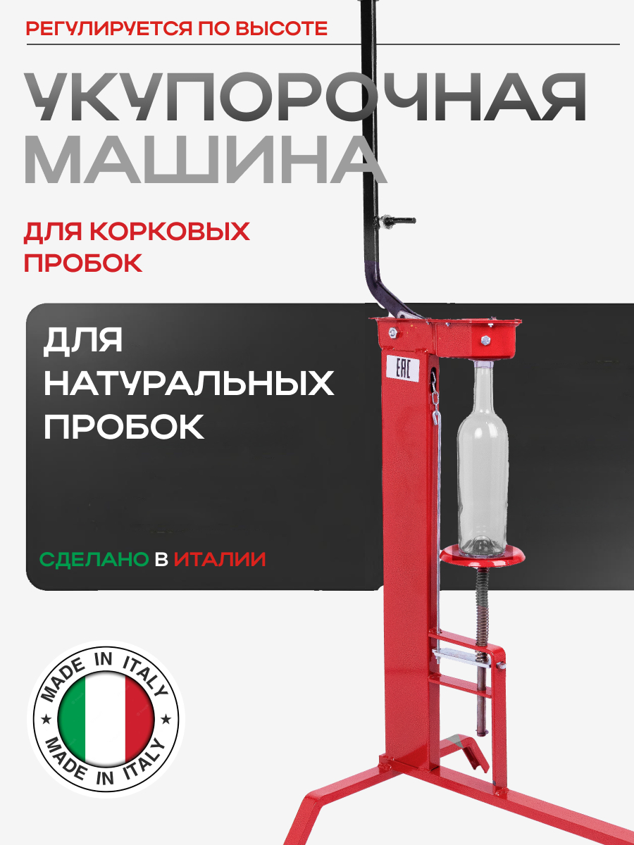 Аппарат окрашен в красный цвет, ручка в черный, с резиновой накладкой для удобства процесса. Итальянское качество обеспечивает долговечное и простое использование укупоривателя пробок.